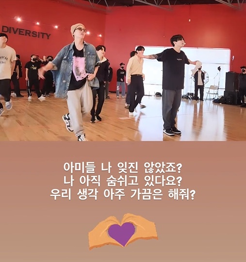 2일 오후 뷔는 개인 SNS에 "아미들 나 잊진 않았죠? 나 아직 숨쉬고 있다요? 우리 생각 아주 가끔은 해줘?"라며 'Permission to Dance' 안무 연습 동영상을 게재했다.
