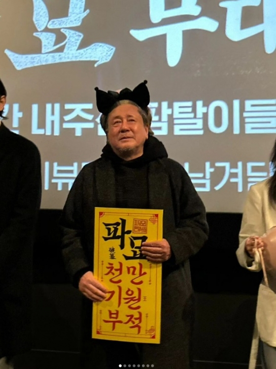 이 가운데 최민식은 팬들이 선물한 깜찍한 캐릭터 머리띠를 쓰고 관객에게 가까이 다가가는가 하면, '파묘 천만 기원 부적'을 들고 있는 등 이색적인 모습을 보여 시선을 사로잡았다.