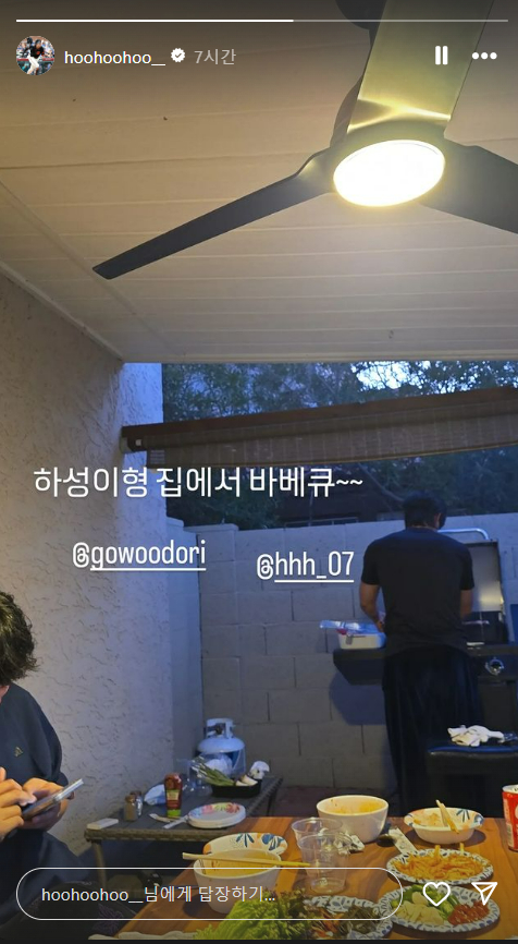 이정후는 자신의 인스타그램에 사진 한 장과 함께 "하성이형 집에서 바비큐~"라는 짧은 글을 올렸다. 김하성이 고기를 굽고 있고 고우석은 휴대전화를 보고 있고 그 모습을 이정후가 찍어서 올린 것으로 보인다.