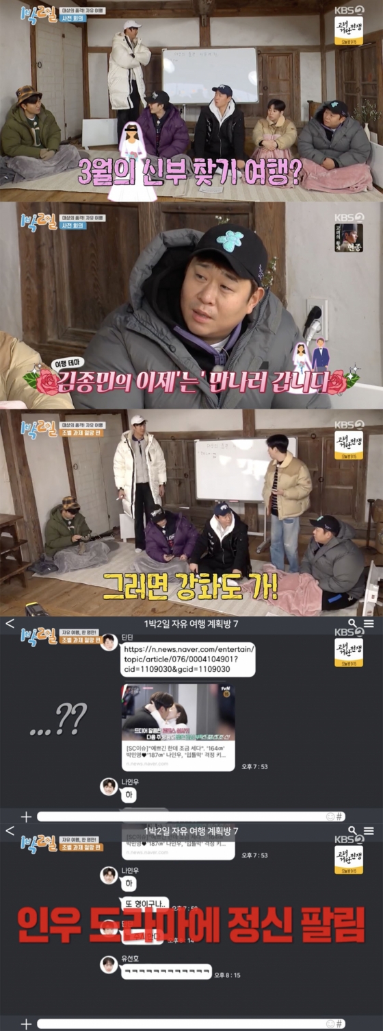 결국 구체적인 여행 계획은 메신저로 이뤄졌다. 그러나 멤버들은 톡 방에서 여행 계획을 짜지 않고 서로 하고 싶은 말만 하기 바빴다. 딘딘은 나인우가 출연한 화제의 tvN 드라마 '내 남편과 결혼해 줘'에서 박민영과 나인우의 키스신 영상 링크를 톡 방에 공유하며 "늘 주시한다"라고 했다. 이에 나인 우는 "하, 또 형이구나..."라며 난색 하는 모습을 보여 보는 이들의 웃음을 자아냈다.