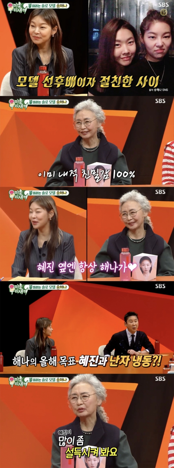 이날 송해나는 평소 절친이자 모델계 선후배 사이인 한혜진의 모친 윤지영과의 만남을 특히 반가워했다. 한혜진 모친 역시 "처음 뵙는데 낯설지 않다. 혜진이가 항상 말했다. 혜진이가 있는 곳에 많이 있지 않았냐"라며 반가움을 표했다. 이에 송해나는 "맞다, 혜진언니 집에도 자주 갔다"라고 답했다.