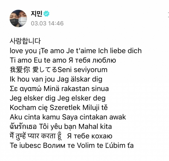 지민은 3월의 첫 휴일인 3일 공식 팬 커뮤니티인 위버스를 통해 '사랑합니다'라며 한국어를 비롯한 영어, 스페인어, 프랑스어, 독일어, 포르투갈어, 러시아어, 중국어, 일본어등 다양한 언어로 팬들에 대한 사랑을 고백해 팬들을 감동시켰다.