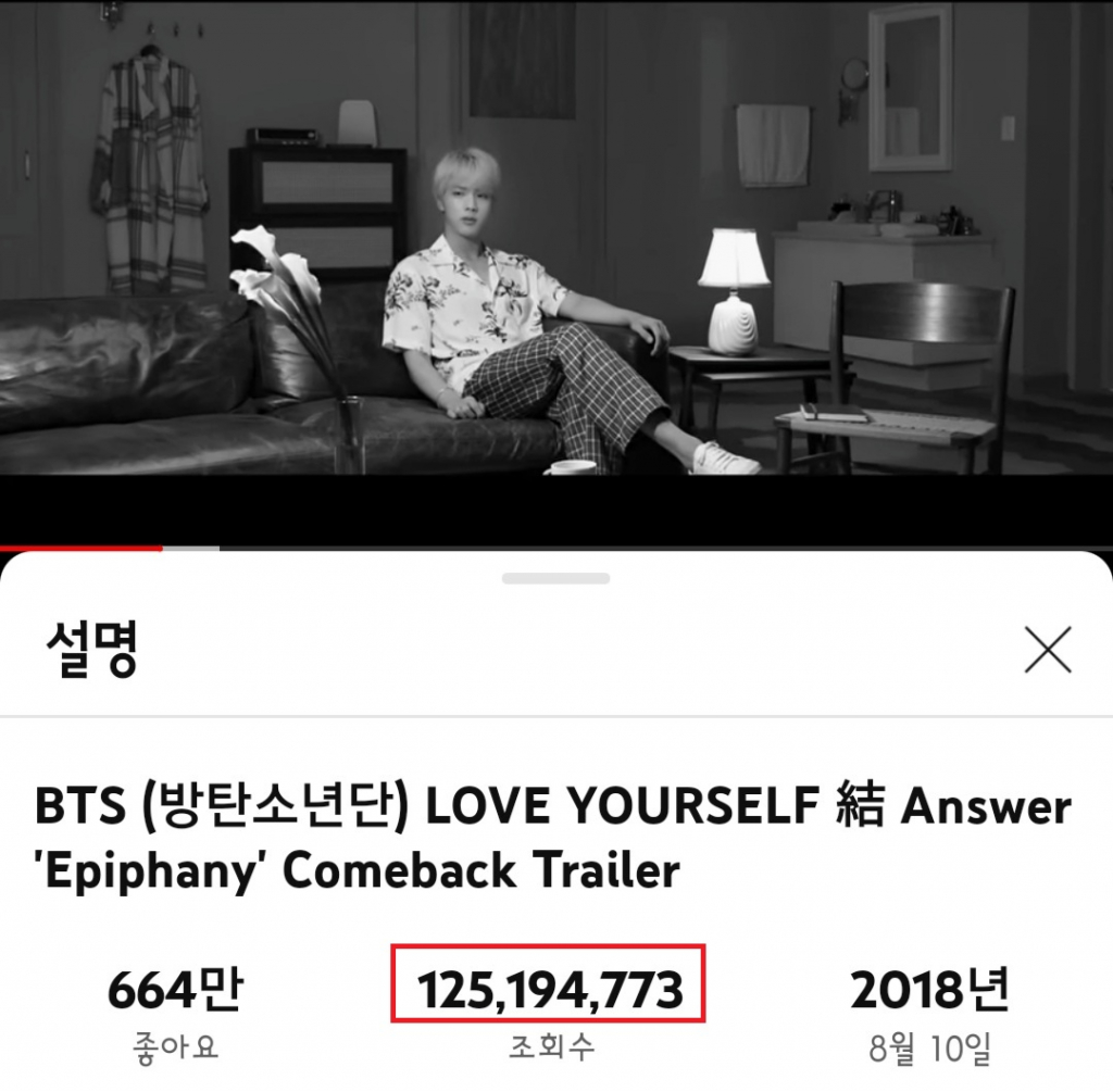 방탄소년단(BTS) 진의 '에피파니'(Epiphany) 뮤직비디오가 조회수 1억 2500만 뷰를 달성하며 인기를 빛냈다.