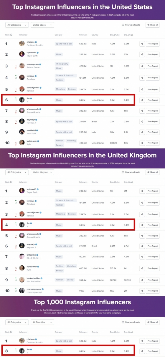 뷔는 마케팅 전략 분석회사 '하이프오디터'가 발표한 '가장 영향력 있는 인플루언서 톱 1000'에서 전 세계 8위, 미국 6위, 영국 4위를 차지해 군복무 중에도 높은 화제성을 이끌어내며 존재감을 자랑했다.
