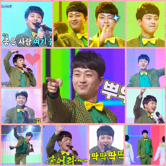실제 딱풀이 연상되는 색상의 의상을 입고 결승 무대에 오른 이찬원은 어깨를 으쓱으쓱하며 상큼하고 발랄한 모습으로 노래 부르기 시작했다.