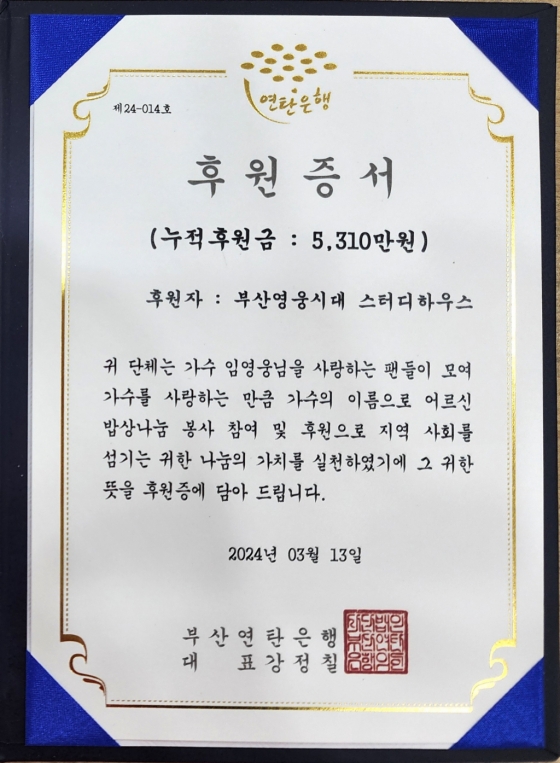 부산영웅시대 '스터디하우스'는 "'혼자가 아닌 같이의 힘으로'라는 슬로건으로 앞으로도 독거노인들을 위해 지속해서 후원과 봉사를 하며 임영웅의 선한 영향력을 널리 퍼뜨리겠다"고 다짐했다.