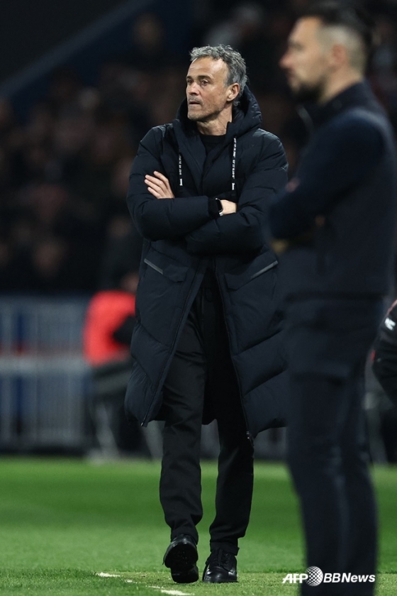 루이스 엔리케 감독이 14일(한국시간) 프랑스 파리의 파르크 데 프랭스에서 열린 '2023~2024시즌 쿠프 드 프랑스(컵대회)' 8강전 PSG 대 니스의 경기를 보며 생각에 잠겨 있다. /AFPBBNews=뉴스1