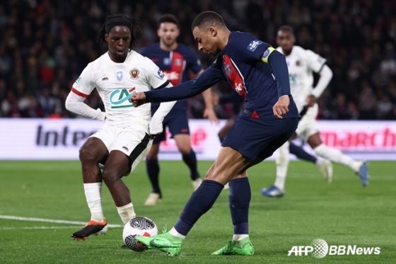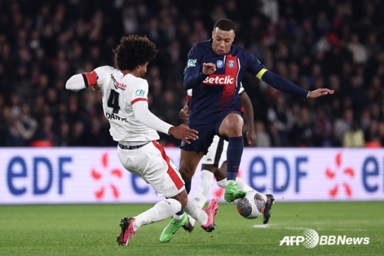 킬리안 음바페(가운데)가 14일(한국시간) 프랑스 파리의 파르크 데 프랭스에서 열린 '2023~2024시즌 쿠프 드 프랑스(컵대회)' 8강전 PSG 대 니스의 경기에서 상대 선수의 견제를 받고 있다. /AFPBBNews=뉴스1