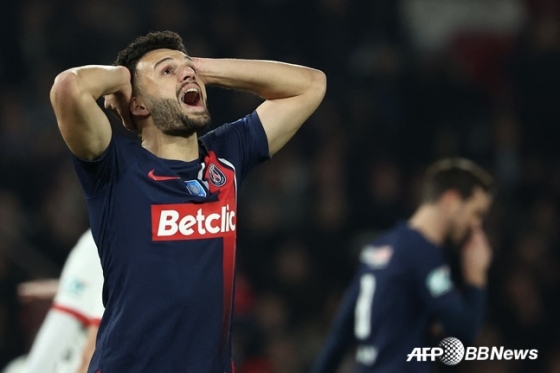 곤살루 하무스가 14일 (한국시간) 프랑스 파리의 파르크 데 프랭스에서 열린 '2023~2024시즌 쿠프 드 프랑스(컵대회)' 8강전 PSG 대 니스의 경기에서 득점 기회를 놓친 후 아쉬워하고 있다. /AFPBBNews=뉴스1