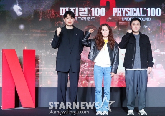 장호기 PD, 강숙경 작가, 이종일 PD가 14일 오전 서울 마포구 호텔 나루 서울 엠갤러리에서 진행된 넷플릭스 오리지널 예능 '피지컬: 100 시즌2-언더그라운드' 제작발표회에 참석해 포즈를 취하고 있다.