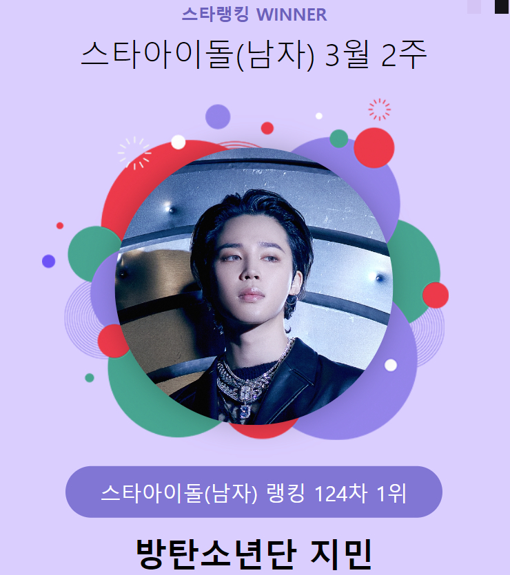 지민은 지난 7일 오후 3시 1분부터 14일 오후 3시까지 진행된 3월 2주(124차) 스타랭킹 스타아이돌 남자 랭킹 투표에서 3만9120표를 획득, 1위에 등극했다.