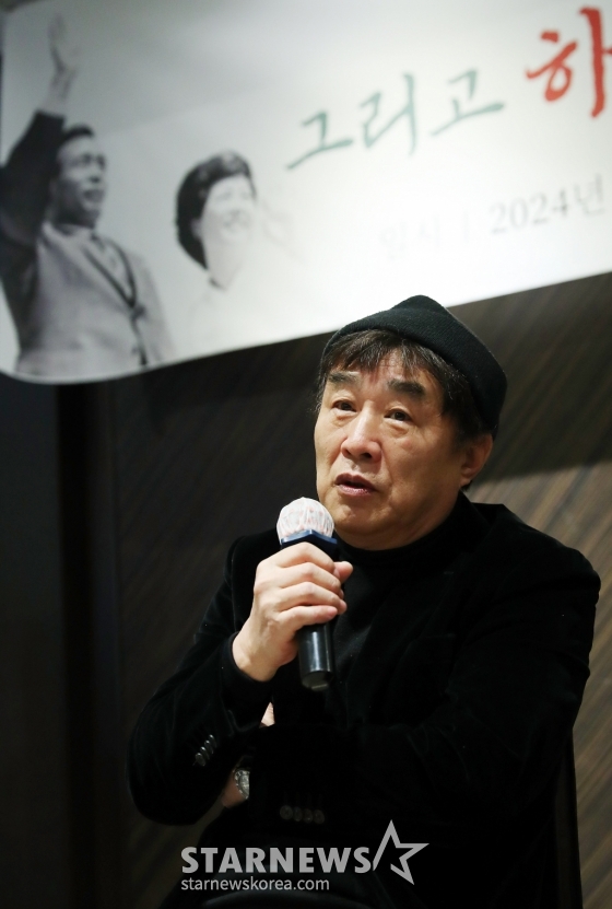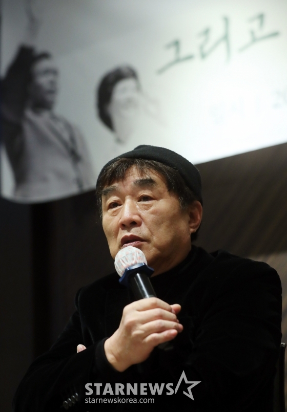 윤희성 감독이 14일 오후 서울 중구 더 플라자 호텔에서 진행된 다큐 영화 '그리고 하얀 목련이 필때면' 제작발표회에서 취재진 질의에 답하고 있다.