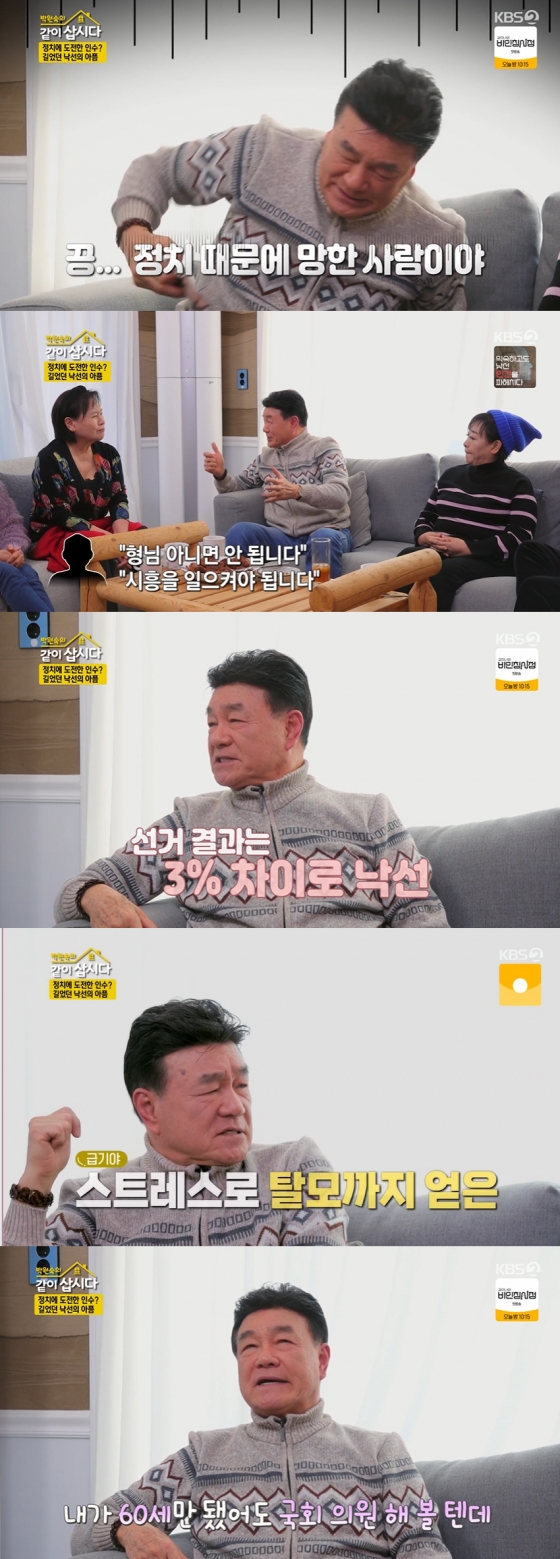 그는 "여행지에서 아내에게 '내가 시장됐다면 당신과 이런 아름다운 시간을 가질 수 있었겠냐?'라고 했지만 마음이 안 풀렸다. 결국 집에 돌아와서도 다시 전국을 돌았다. 맛있는 음식을 앞에 두고도 아내에게 '내가 시장이 됐다면 당신과 이렇게 맛있는 음식을 먹을 수 있었겠어?'라고 했지만 여전히 쓰라렸다"라고 고백했다. 그러면서 "그 이후에 머리카락이 다 빠졌다. 머리가 뚫렸다"라며 스트레스 탈모를 얻게 됐다고 덧붙였다.