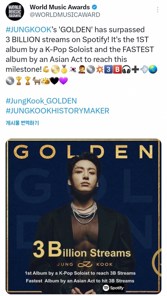 월드뮤직어워드(WMA) 공식 계정에 따르면, 'GOLDEN'은 스포티파이 역사상 가장 빠르게 30억을 달성한 아시아 가수의 정규 음반(studio album)과 K-팝 솔로 가수 최초로 30억을 돌파한 앨범이라는 신기록을 또 한번 세웠다.
