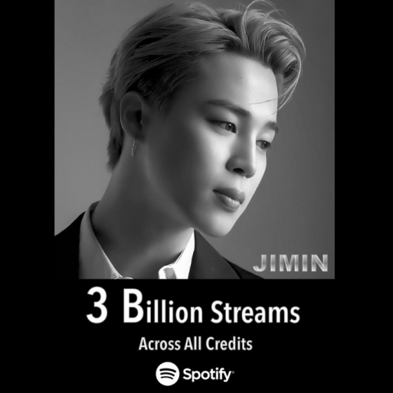 3월 24일 스포티파이 기록에 따르면 지민은 스포티파이 공식 프로필에서 전체 30억 스트리밍을 돌파하며 전 세계적인 음원 파워를 과시하고 있다.