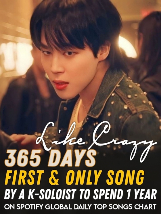 또한 '라이크 크레이지'는 아시아 가수 솔로곡으로 60년 만에 미국 빌보드 '핫100' 차트 1위를 차지한 명성에 걸맞게 31일 기준 미국 스포티파이 일간 톱송 차트에 162일 차트인으로 한국 솔로곡 최장 기록과 함께 브라질 일간 톱송 차트 최장 161일, 캐나다 일간 톱송 차트에 유일하게 이름을 올린 K팝 솔로곡으로 전 세계에서 뜨거운 사랑을 받고 있다.