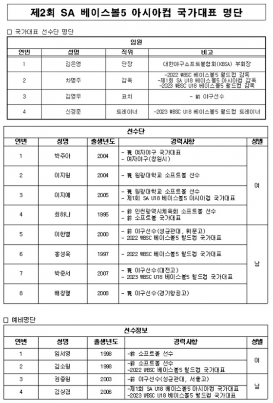 협회는 월드컵 출전권 획득이라는 목표 아래 2022 WBSC 베이스볼5 월드컵 대표팀 감독을 역임한 차명주(51) 감독을 대표팀 수장으로 선임하고, 1·2차 국가대표 선발전을 통해 남자(이한별, 홍성욱, 박준서, 배창렬), 여자(최하나, 이지원, 박주아, 이지예) 각각 4명씩 8명의 선수와 4명의 예비 선수도 함께 선발했다.