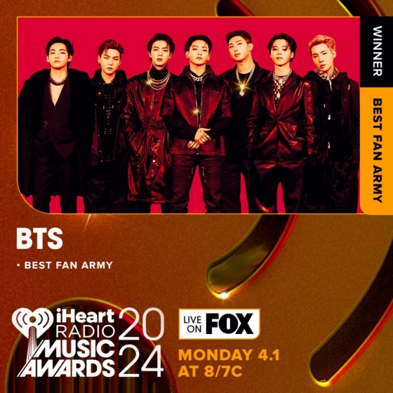 방탄소년단은 1일(현지시간) 미국 로스앤젤레스에서 열린 '2024 아이하트라디오 뮤직 어워드'에서 '베스트 팬 아미' 부문을 수상했다. 방탄소년단은 지난 2018년 이 부문에 첫 노미네이트된 이래 단 한 차례도 놓치지 않고 7년 연속 트로피를 거머쥐었다.