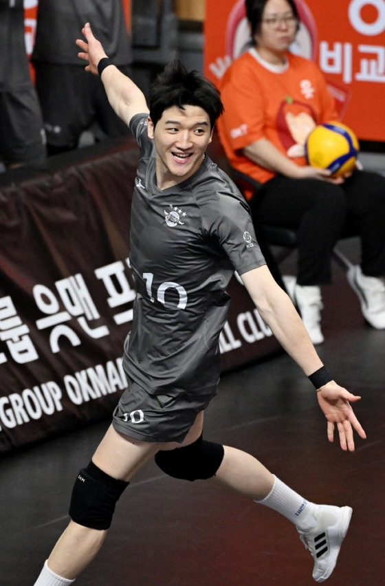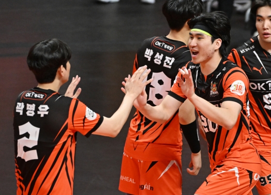 주포 대결이 치열했다. OK금융그룹은 레오의 공격 점유율을 높이며 경기를 풀었다. 세트 스코어로 다가갈수록 OK금융그룹의 기세가 확 올랐다. 곽명우의 블로킹 성공으로 24-22가 됐다.