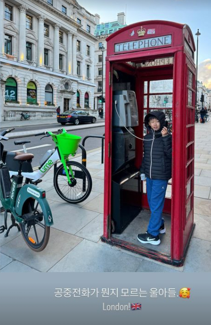 이어 강수정은 런던에서 찍은 아들의 모습도 사진으로 남기고 "공중전화가 뭔지 모르는 울 아들"이라고 남겼다.