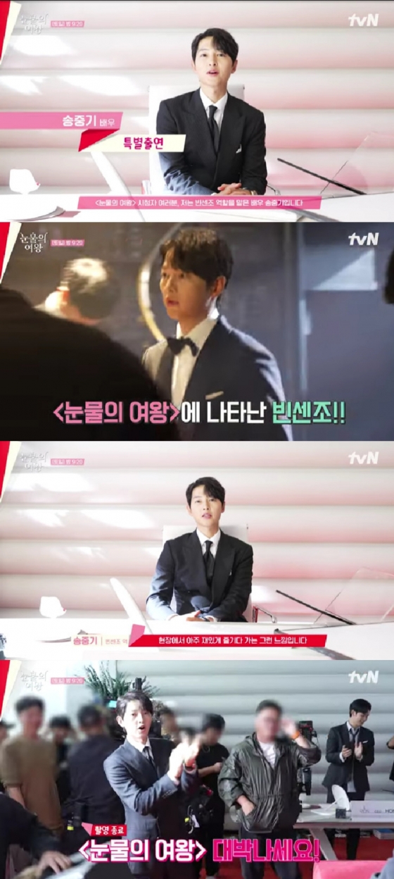 앞서 송중기는 지난 3월 31일 방송된 tvN 토일드라마 '눈물의 여왕' 8회에서 홍해인(김지원 분)의 변호사 '빈센조'로 특별출연했다. 그는 2021년 방송된 드라마 '빈센조'에서의 모습 그대로 완벽한 슈트핏과 카리스마 있는 눈빛을 자랑했다.