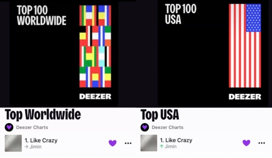 지민의 솔로 앨범 '페이스'(FACE)의 타이틀곡 '라이크 크레이지'(Like Crazy)는 4월 7일 글로벌 음원 스트리밍 플랫폼 디저(Deezer)의 '미국 톱100' 차트에서 1위에 올랐다. 한국어곡으로 차트 역사상 K팝 솔로곡 최초이자 유일한 신기록이다.