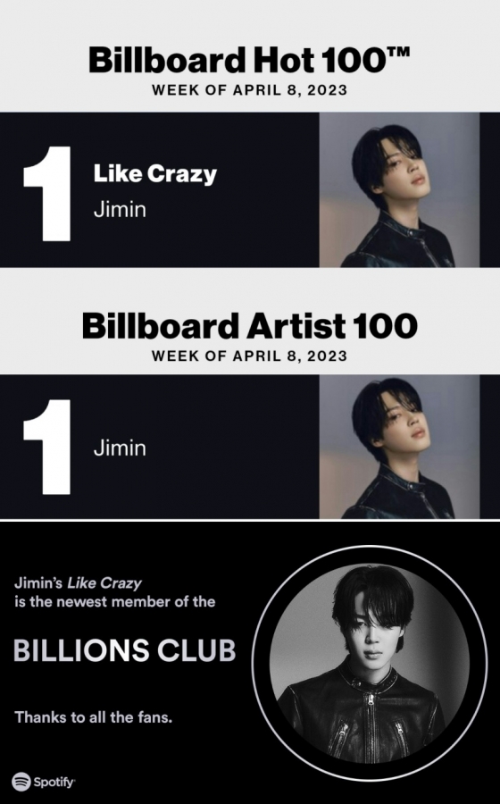 지민은 한국 솔로 가수 최초 빌보드 메인 싱글 차트 '핫100' 1위와 '아트스트100' 1위를 차지해 대중음악계의 큰 획을 그은데 이어 미국 디저 차트에서도 새역사를 만들어내며 또 한번 팝의 본고장인 미국을 뒤흔들고 있다.