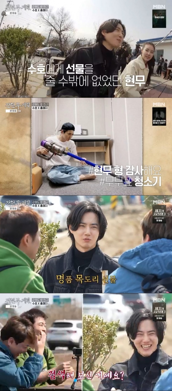 이날 수호는 "(전) 현무 형을 마지막으로 본 게 군 복무하기 전이다. 제가 생일이었는데 당시 팬들이 제 생일이라고 하니까 형이 저에게 선물을 줄 수밖에 없었다. 그래서 청소기를 선물해 주셨다"고 밝혔다.