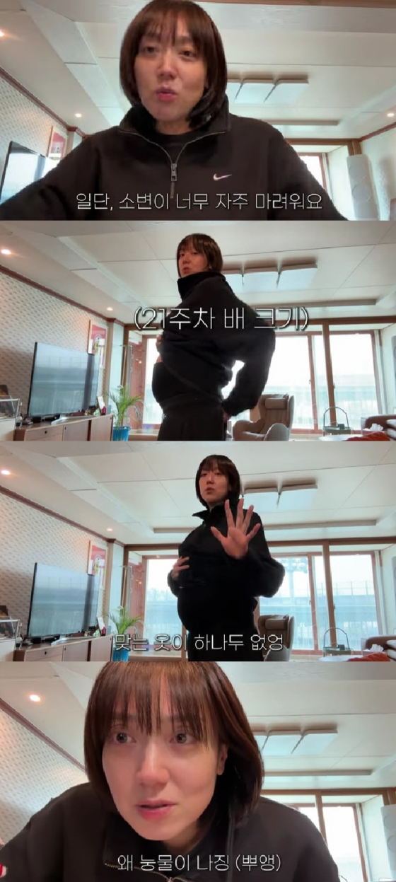 이날 이은형은 "임신한 지 21주가 됐는데 제 몸의 변화에 관해서 얘기해 보고 싶다"며 "소변이 너무 자주 마렵다. 잘 때도 똑바로 못 누워있다. 똑바로 누우면 자궁이 배를 눌러서 계속 소변이 마렵다. 누워있으면 배 위에다가 큰 돌을 얹고 있는 느낌이 들고, 너무 답답하다"라고 토로했다.
