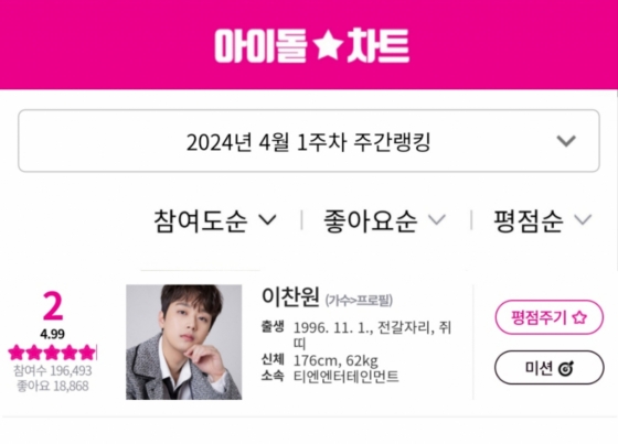 이찬원은 4월 1주 차 아이돌차트 평점랭킹에서 19만 6493표를 획득, 전체 2위를 차지했다.