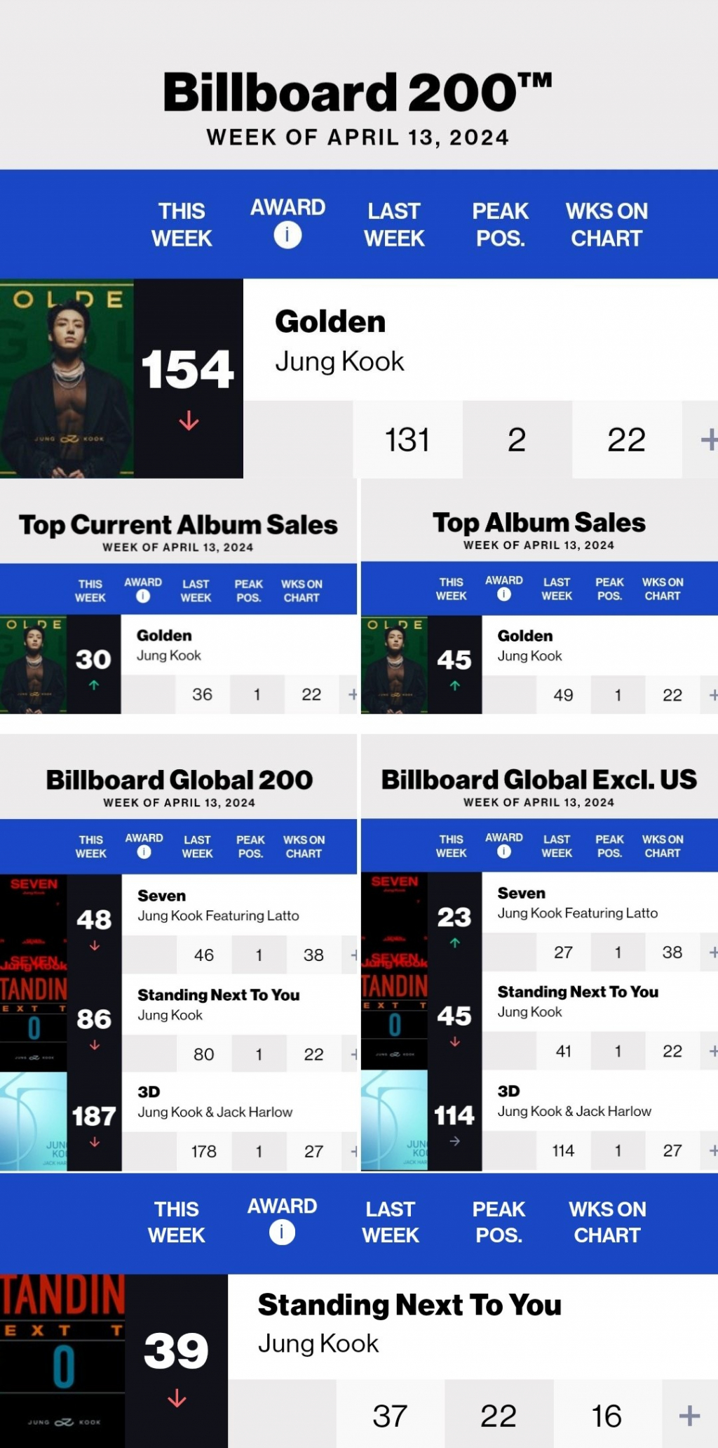 미국 음악 전문 매체 빌보드가 발표한 최신 차트(4월 13일 자)에 따르면, 정국의 솔로 앨범 'GOLDEN'(골든)은 '빌보드 200'에서 154위를 차지했다.
