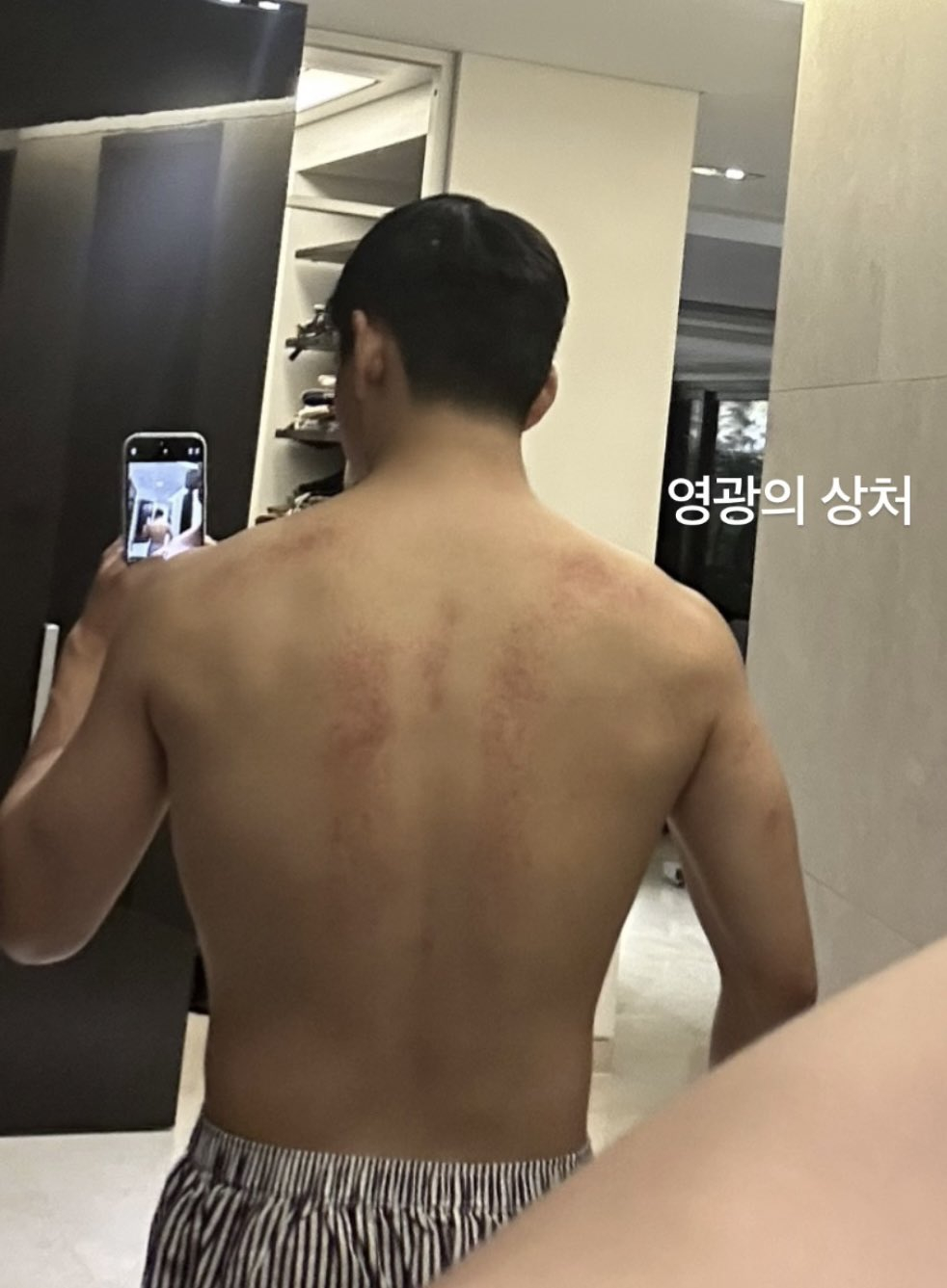위버스에는 "영광의 상처"라는 글과 함께 한 장의 사진을 게재했다. 공개된 사진에는 뷔가 상탈을 하고 상반신을 찍은 모습이 담겼다. 등과 어깨에는 훈련으로 인해 생긴 상처로 인해 빨갛게 자국이 남았지만 뷔는 영광의 상처라며 늠름하고 의연한 모습을 보였다.