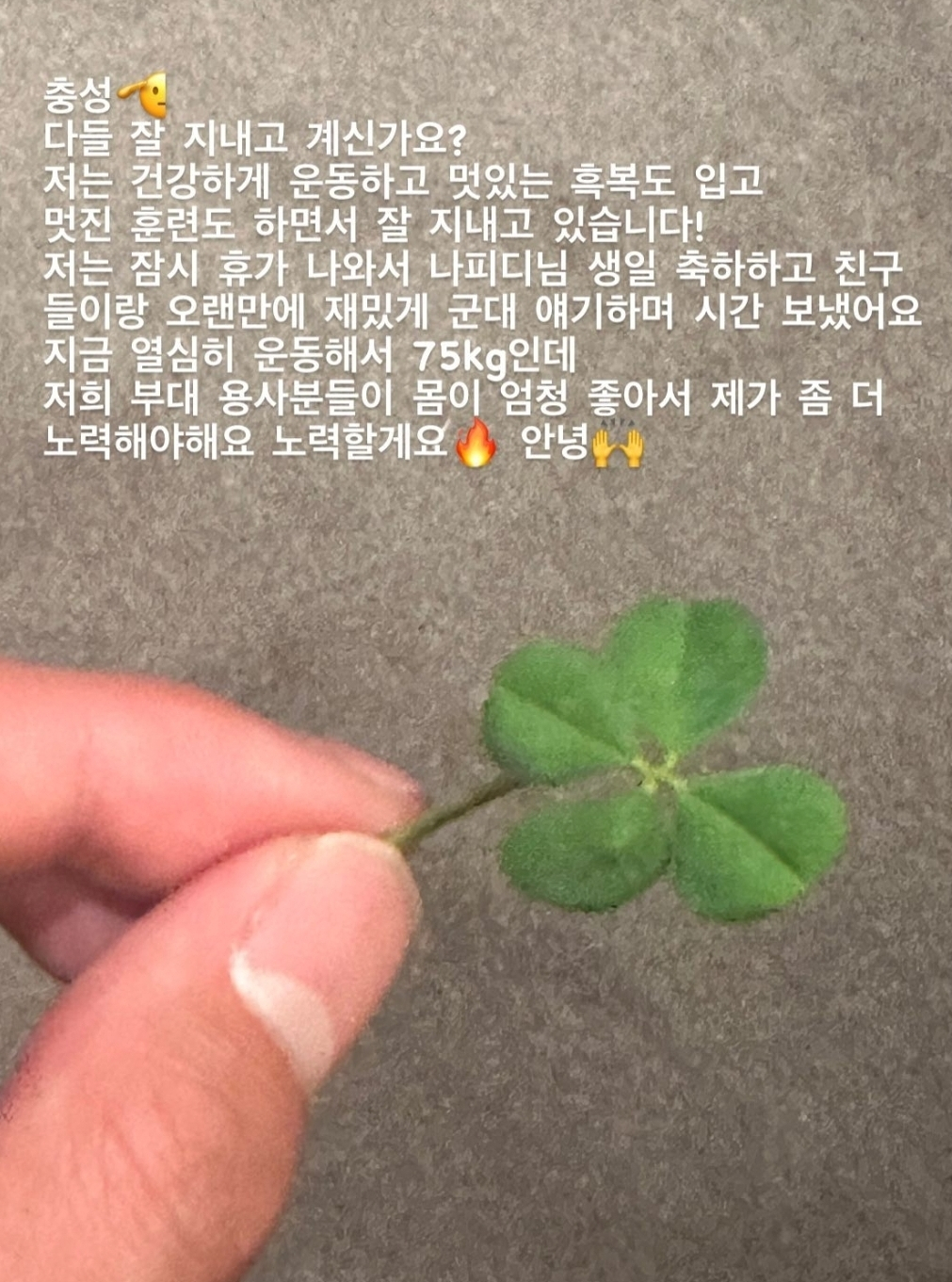 인스타그램에는 팬들을 위해 행운의 네잎클로버를 함께 공개하기도 했다. 네잎 클로버 사진과 함께 "충성. 다들 잘 지내고 계신가요?"라고 인사를 전한 뒤 "저는 건강하게 운동하고 멋있는 흑복도 입고 멋진 훈련도 하면서 잘 지내고 있습니다"라고 알렸다.