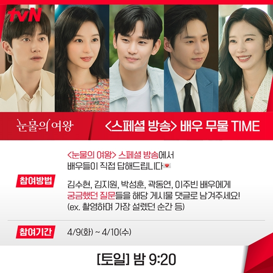 또한 배우들은 시청자들이 남긴 댓글도 직접 읽고 답할 예정이다. 여기에 '배우 무물 TIME'도 진행된다. '배우 무물 TIME'도 배우들도 직접 답한다. 이에 기존 흥행 드라마 스페셜보다 풍성하고 알찬 재미가 시청자들에게 전달될 것으로 기대되고 있다. 김수현, 김지원과 곽동연, 이주빈 등 '눈물의 여왕' 주역들이 직접 전하는 내용이 궁금증을 자아낸다. 주요 배우들에 대한 질문 접수는 tvN drama 인스타그램을 통해 공지된 지난 9일, 10일까지 이뤄졌다.