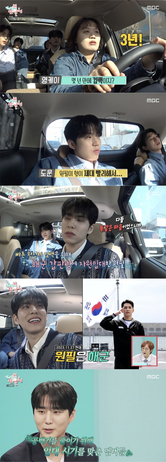 이를 들은 도운은 "원필이 형이 제대를 빨리해서"라고 했다. 이에 원필은 "빨리 나오려고 열심히 했다"라며 빠른 완전체 컴백을 위해 해군 갑판병에 자원입대한 것을 언급하며 그룹을 향한 애정을 드러냈다.