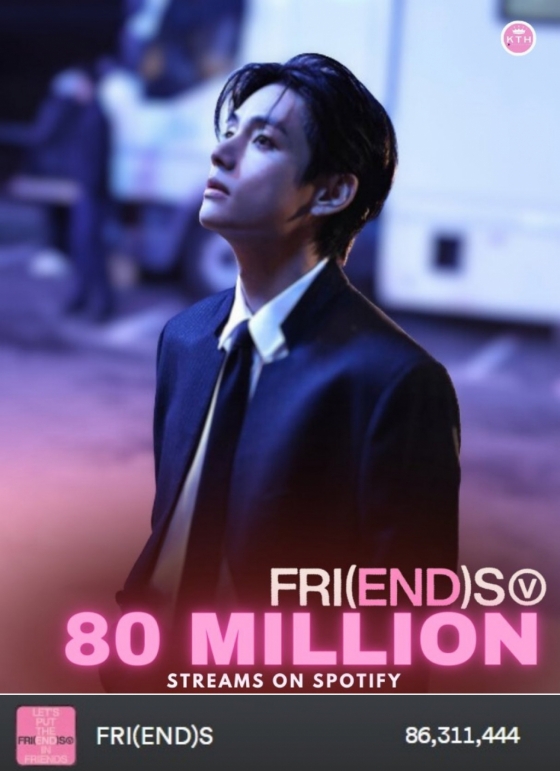 방탄소년단(BTS) 뷔의 신곡 '프렌즈'(FRI(END)S)가 세계 최대 음악 스트리밍 플랫폼 스포티파이에서 8000만 스트리밍을 돌파하여 인기를 빛냈다.