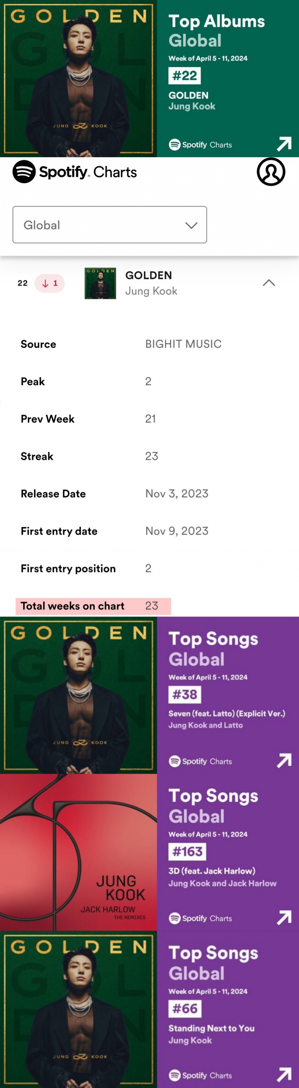 이와 함께 스포티파이 '위클리 톱 송 글로벌' 차트(4월 5일~11일)에서는 정국의 솔로 싱글 'Seven'(세븐)이 38위, '3D' 163위, 'GOLDEN' 앨범 타이틀곡 'Standing Next to You'(스탠딩 넥스트 투 유) 66위로 총 3곡이나 랭크됐고, 각각 39주, 28주, 23주째 진입했다.