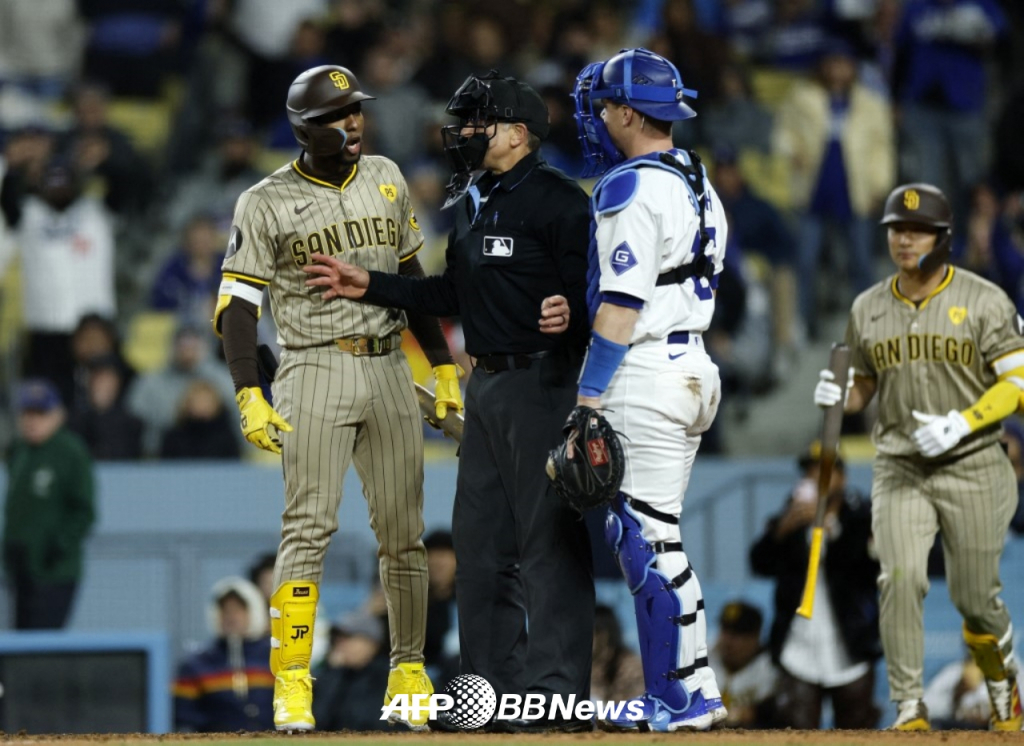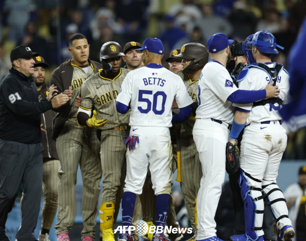 한편 이날 경기에서는 벤치클리어링도 발발했다. 5회 1사 주자 없는 상황에서 김하성의 절친으로 알려진 주릭슨 프로파가 타석에 들어섰다. 다저스 선발 개빈 스톤의 퍼펙트 투구가 계속되고 있는 상황. 이어 스톤이 볼카운트 1-0에서 2구째 커터를 프로파의 몸쪽으로 가깝게 붙여 던졌다. 그러자 프로파는 타석에서 벗어난 뒤 스톤을 쳐다봤다. 이후 다시 타석에 선 프로파. 그런데 이번에는 다저스 포수 윌 스미스가 프로파를 향해 무언가 말을 건넸다. 둘은 서로 양보하지 않은 채 언쟁을 벌였고, 그 시간이 길어지자 결국 두 팀 선수들이 모두 벤치를 비우고 나오는 벤치클리어링이 벌어졌다. 김하성과 마이크 쉴트 샌디에이고 감독까지 벤치클리어링에 가담했고, 말리는 데 힘썼다. 이 과정에서 샌디에이고 마쓰이 유키가 모자를 벗은 채 미소를 지으며 가담하자, 오타니가 이를 한동안 물끄러미 바라보다가 달콤한 눈웃음을 날리기도 했다. 다행히 난투극 등 더 이상의 큰 불상사로 번지지 않은 채 벤치클리어링은 마무리됐다.