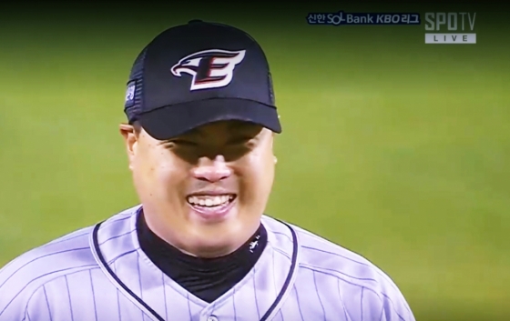 그리고 2구째. 류현진이 포수 최재훈의 사인에 고개를 저었다. 한 번, 두 번, 그리고 세 번. 이번에는 빠른 볼일까. 아니었다. 이번에도 폭포수 커브(116km)가 다시 한번 포물선을 그리며 몸쪽 낮은 코스로 파고들었다. 양의지는 이번에는 기다리지 않고 배트를 힘차게 휘둘렀으나 빗맞으면서 파울이 됐다. 바로 이 순간, 양의지는 류현진을 쳐다보며 이른바 '식빵'을 구웠고, 그런 모습을 본 류현진은 크게 웃었다. 그야말로 자신이 수 싸움에서 완벽하게 이겼다는 듯이….