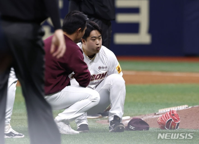 주자를 잡은 김재웅은 이윽고 마운드에 쓰러져 고통을 호소했다. 코칭스태프와 트레이너가 나와 상태를 체크했고, 본인이 연습구를 던져보며 투구를 이어가겠다는 뜻을 밝혔다. 결국 키움은 투수교체 없이 이닝을 이어갔다.