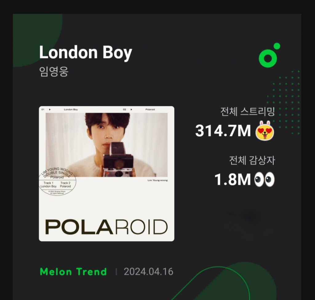 가수 임영웅의 '런던 보이'(London Boy)가 국내 주요 음원 플랫폼 멜론(Melon)에서 3억 스트리밍을 돌파했다.