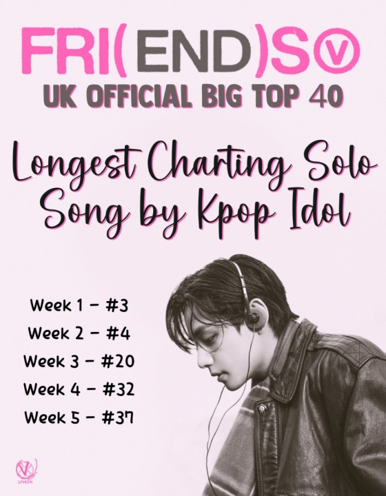 방탄소년단(BTS) 뷔의 '프렌즈'(FRI(END)S)'가 영국 '오피셜 빅 톱 40'에 5주 연속 진입하며 인기를 빛냈다.