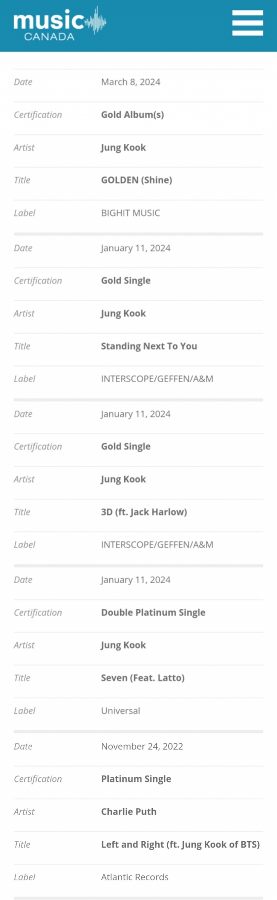 정국은 '뮤직 캐나다'에서 'Seven'(세븐)으로 '더블 플래티넘 싱글'(Double Platinum Single, 16만 유닛), '3D'와 'Standing next to you'(스탠딩 넥스트 투 유)로 '골드 싱글'(Gold Single, 4만 유닛) 인증을 나란히 획득했다.