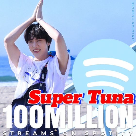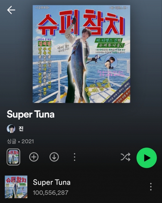 방탄소년단(BTS) 진의 자작곡 '슈퍼 참치'(Super Tuna)가 스포티파이에서 막강 음원 파워를 빛냈다.