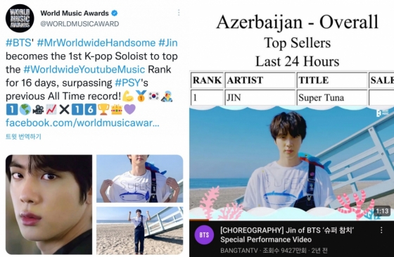 진의 '슈퍼 참치' 스페셜 퍼포먼스 비디오는 16일 연속 유튜브(YouTube) 인기 동영상 음악 부문 1위를 차지하며 싸이(PSY)의 기록을 넘어 K팝 솔로 아티스트 사상 최장 기간의 대기록을 가지고 있다.