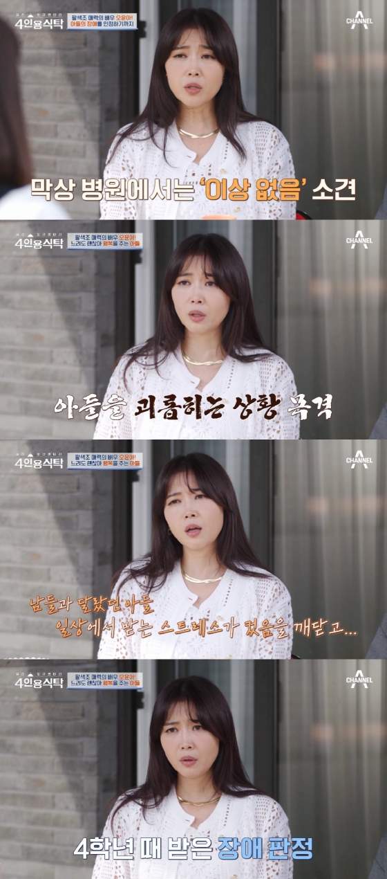 이에 오현경은 "웃으면서 얘기 할 수 있는 날이 온다. 동료로서, 여자로서, 엄마로서 너무 대견하다"라고 응원했다. 또한 오윤아는 "아들이 병원에서 장애 판정도 안 나오고, 특수학교도 많지 않아서 입학도 쉽지 않았다. 일반 학교에 다니면서 스트레스를 많이 받았더라. 예민하니까 작은 스트레스에도 과민 반응을 보였다. 체육 대회 날 학교를 찾아갔는데 아들을 괴롭히는 상황을 목격했다. 아들이 스트레스가 컸다는 걸 깨닫고, 정신을 다잡았는데도 많이 힘들었다"고 털어놨다.