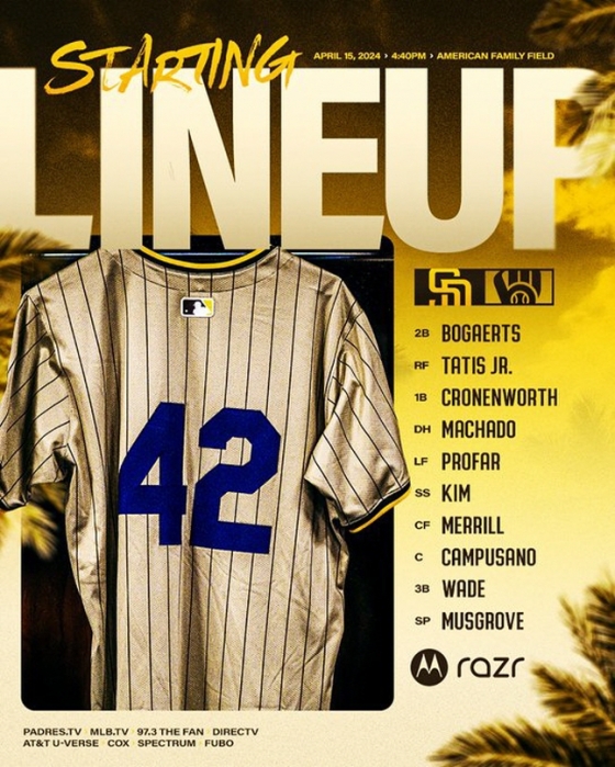 이날은 흑인으로서 최초로 MLB에 진출해 전설적인 선수로 발돋움한 재키 로빈슨을 기리는 '재키 로빈슨 데이'로 진행됐다. 30개 구단 전 선수들은 모두 그의 등번호인 42번을 달고 경기를 펼쳤다. 김하성 또한 예외 없이 42번을 달고 경기에 나섰다.