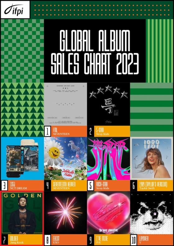 정국은 '국제음반산업협회'(IFPI)가 최근 발표한 '2023 글로벌 앨범 세일즈 차트'(Global Album Sales Chart 2023)에서 지난해 11월 발매한 솔로 앨범 'GOLDEN'(골든)으로 7위를 차지했다.