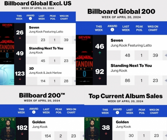 미국 음악 전문 매체 빌보드가 발표한 최신 차트(4월 20일 자)에 따르면, 정국의 솔로 싱글 'Seven'(세븐)과 '3D', 솔로 앨범 'GOLDEN'(골든) 타이틀곡 'Standing Next to You'(스탠딩 넥스트 유)는 '글로벌(미국 제외)' 차트에서 26위, 123위, 49위를 차지했다.