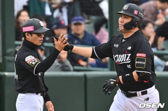 이에 맞서 KT는 천성호(2루수)-김민혁(중견수)-강백호(지명타자)-로하스(좌익수)-문상철(1루수)-장성우(포수)-황재균(3루수)-조용호(우익수)-김상수(유격수) 순으로 선발 라인업을 꾸렸다. 선발 투수는 쿠에바스였다.
